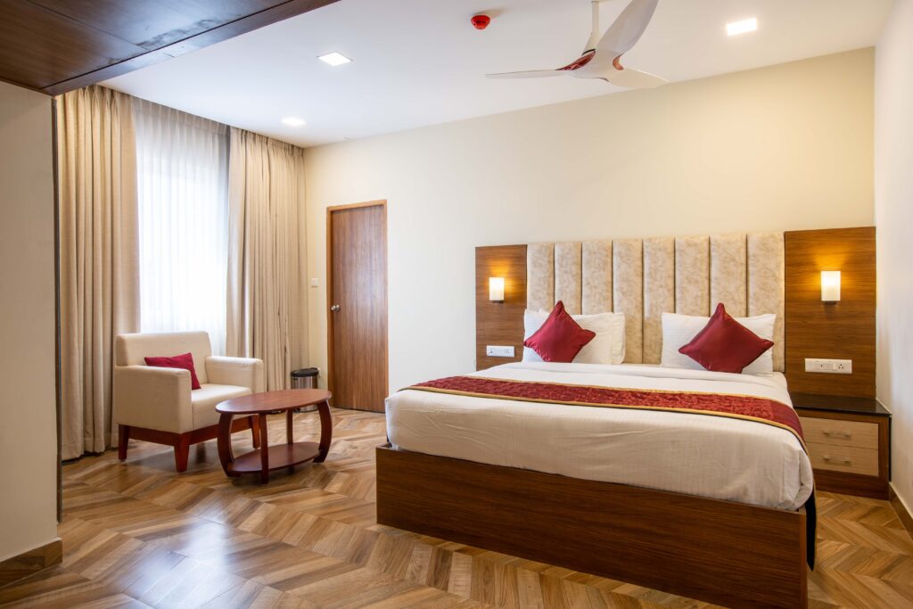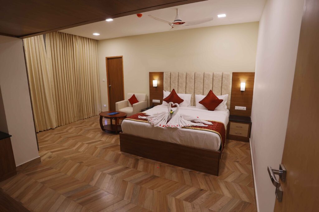 Our rooms are very spacious and we have a clean and neat bathroom. You can feel a pleasant stay with us. We do support 24 x 7 room service, Doctor on call, complimentary breakfast, Complementary Wi-Fi, Satellite TV, hot and cool water etc.