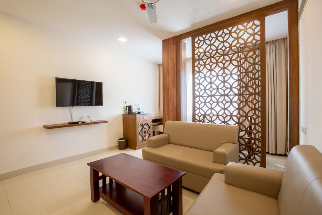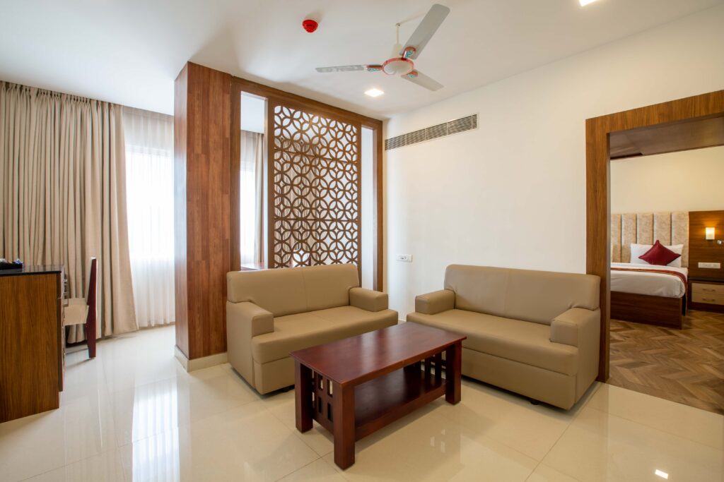 Living room with triple sofa , dedicated dining space with dining table & chairs, pet table, LED tv, mini bar, cookies basket, Telephone, luggage rack, wardrobe, kettle with complimentary tea / coffee amenities, mineral water, LED tv, single sofa, pet table, study table with chair, King Bed, more spacious bathroom with amenities, hand wash liquid dispenser, hair dryer, additional mirror & bath fittings.
